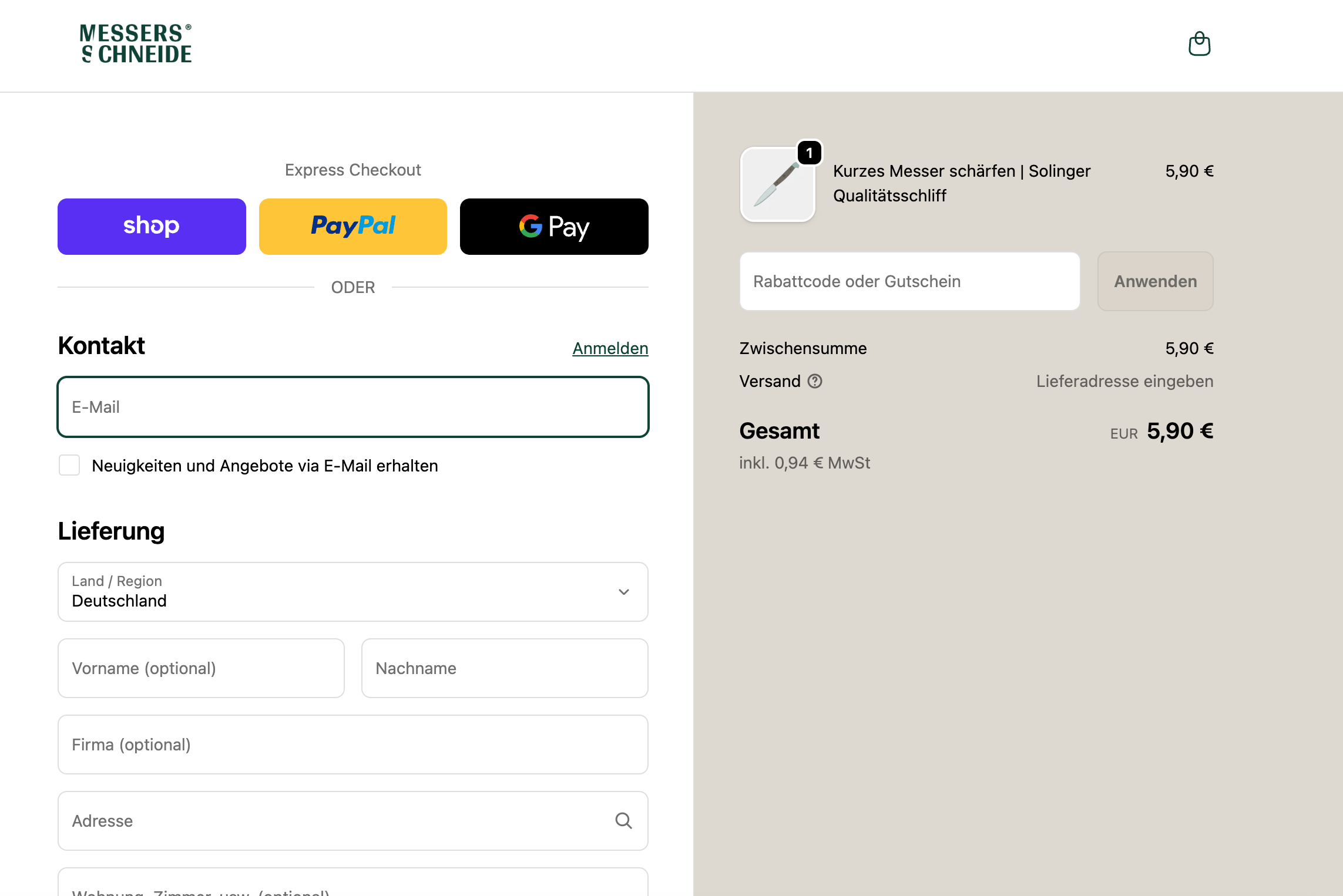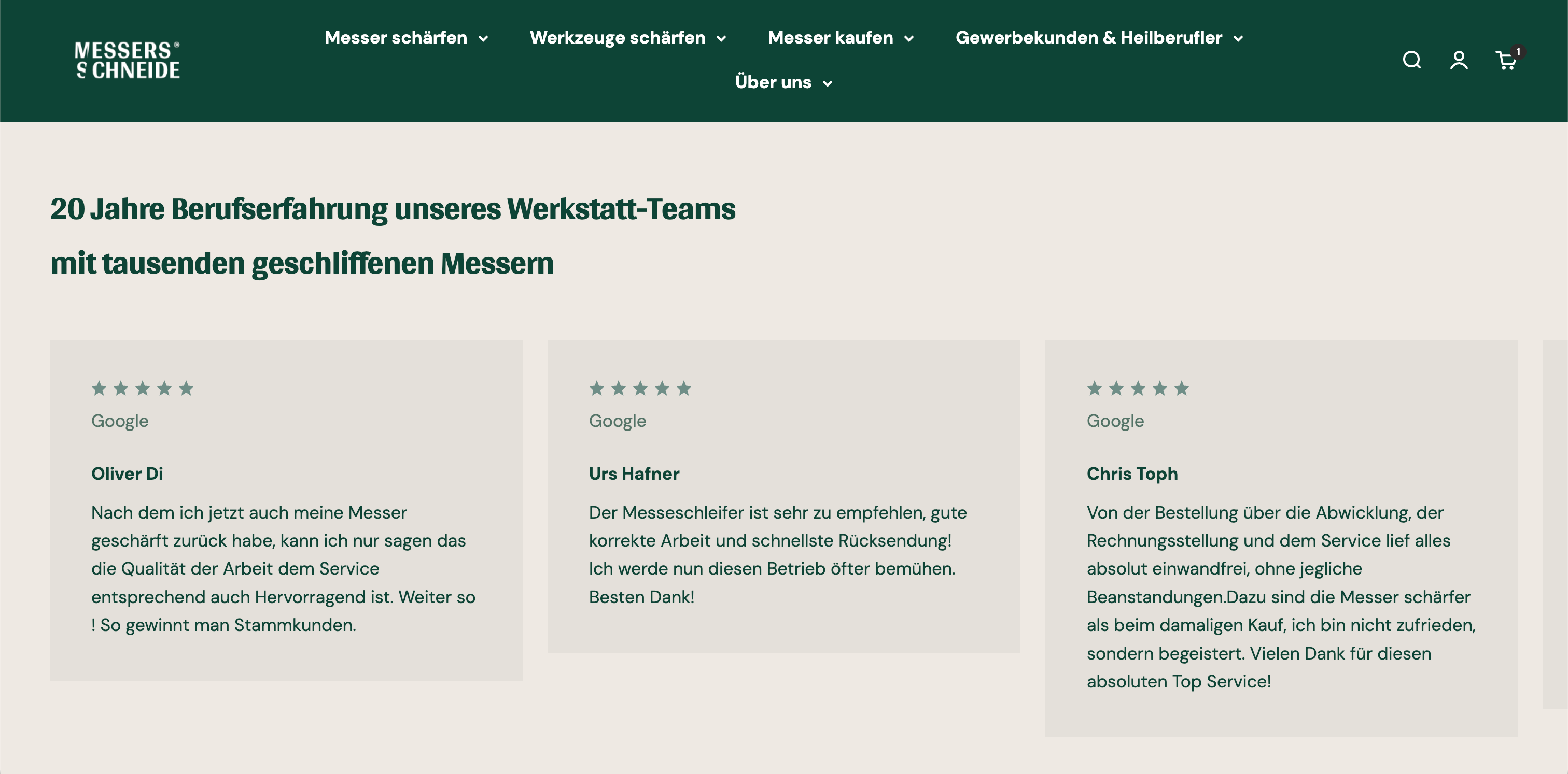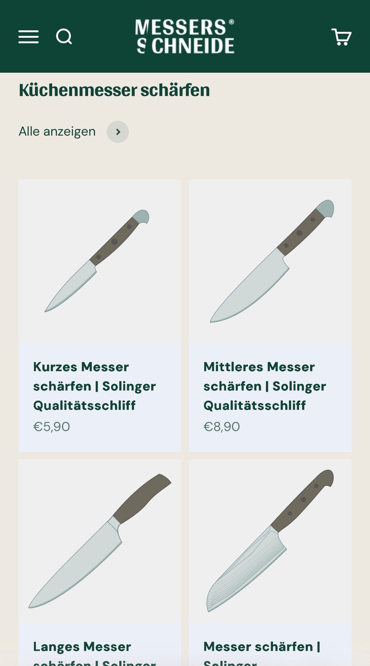 MESSERS SCHNEIDE GmbH hat sich in wenigen Jahren zu einer der größten und modernsten Schleifereien für Messer, Scheren und medizinische Instrumente entwickelt. Wir nehmen stumpfe Klingen direkt in unserer Schleiferei in Solingen entgegen und beraten unsere Kunden auch kompetent in unserem Büro in Köln. Unsere Partnergeschäfte bieten darüber hinaus weitere verlässliche Abgabemöglichkeiten für Ihre stumpfen Klingen. Unsere Mission ist es, Qualität, Präzision und Zuverlässigkeit zu vereinen – damit Ihre Messer, Scheren und Instrumente wieder wie neu funktionieren.