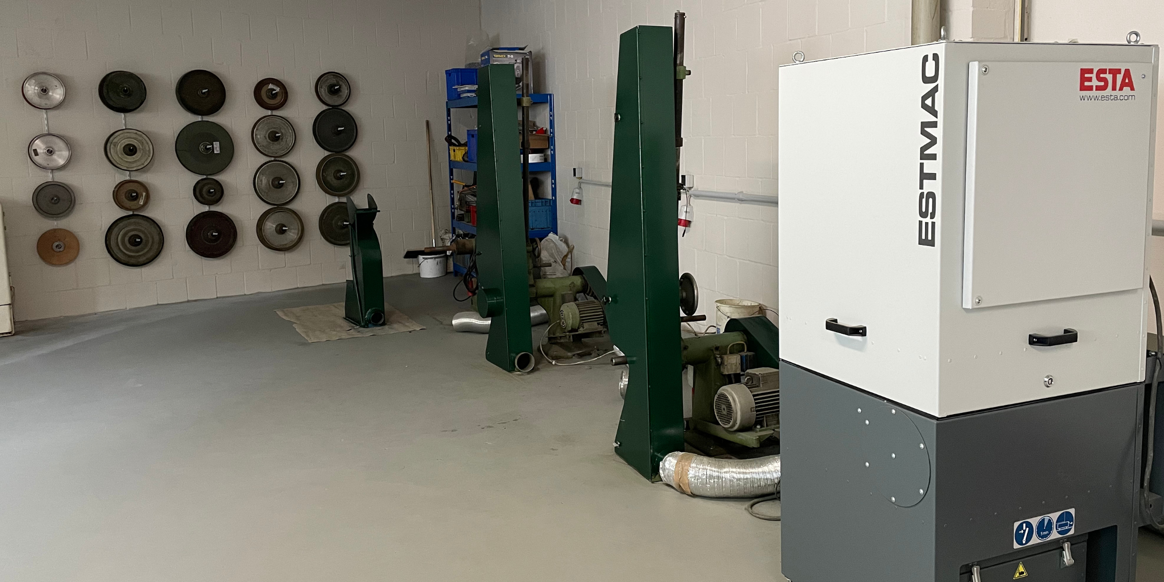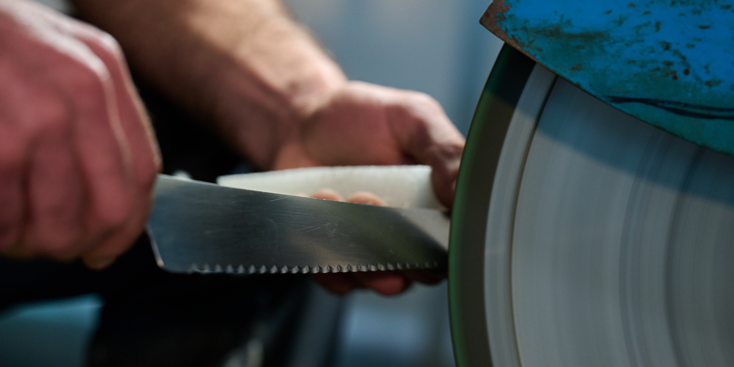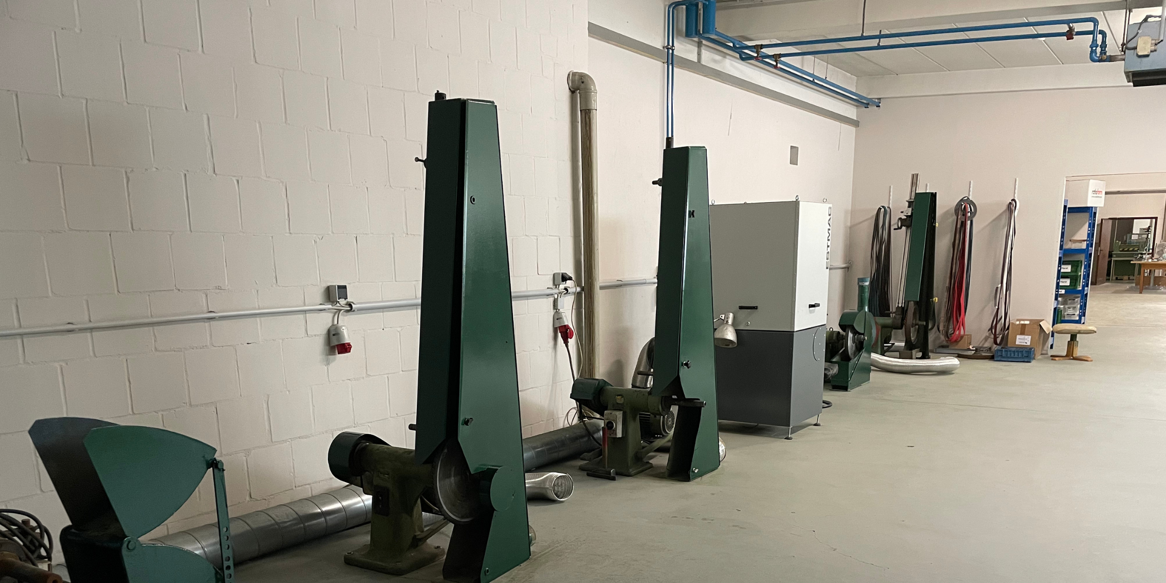 Klingt kompliziert, aber machbar. Letztlich haben wir über zwei Jahre nach der passenden Werkstatt gesucht und Dutzende Räume, Schleifereien und Werkstätten aufgesucht. Nun endlich, seit dem 1. April 2025, bin ich stolzer Betreiber einer modernen Schleiferei, die sämtliche der oben genannten Bedarfe erfüllt. Unsere neue Schleiferei war ehemals ein Lagerraum und musste in vielen Stunden harter Arbeit und der Unterstützung durch Profis zu einer Schleiferei mit den benötigten Starkstromleitungen, Zwischenwänden, Beleuchtung, etc. umgebaut werden. Mittlerweile stehen sechs Solinger Schleifböcke zum Vorschleifen, Abziehen und Polieren bereit. Auf kleinen, aber feinen Tischschleifmaschinen schleifen wir z. B. die Wellenverzahnung in Tafelmesser und Steakmesser ein. Für saubere Luft sorgt dabei eine hochmoderne Absauganlage der Firma ESTA. Und Platz für den Stolz unseres Maschinenparks, eine ebenfalls hochmoderne Nassschleifmaschine von REMA, haben wir ebenfalls. Auf dieser Maschine bearbeiten wir die besonders hochwertigen Küchenmesser von z. B. KAI, Suncraft oder Nesmuk.