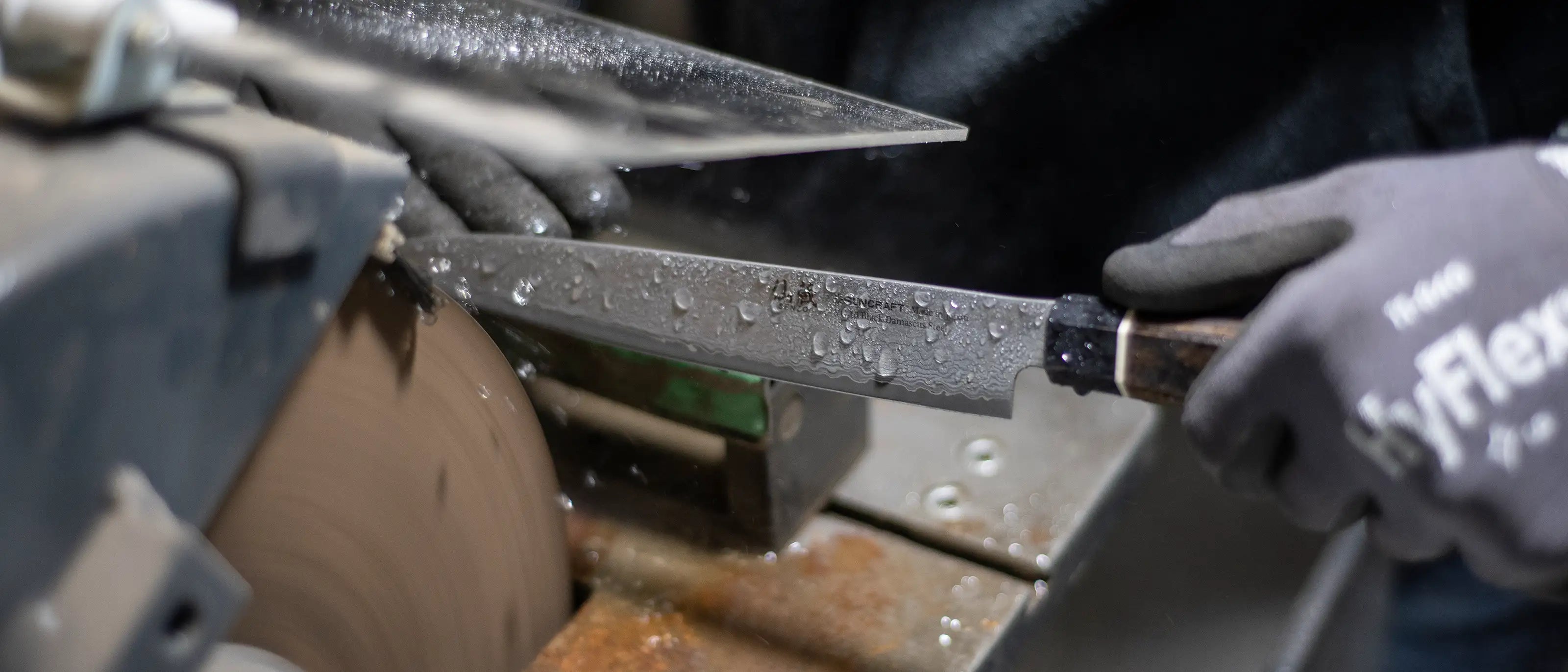 Auf einer der modernsten Nassschleifmaschinen schärfen wir besonders hochwertige Messer auf dem nassen Stein (Solinger Exklusivschliff). Ähnlich wie in Japan nutzen wir diese Art zu schleifen für das Schärfen hochwertiger Damaststahl-Messer.